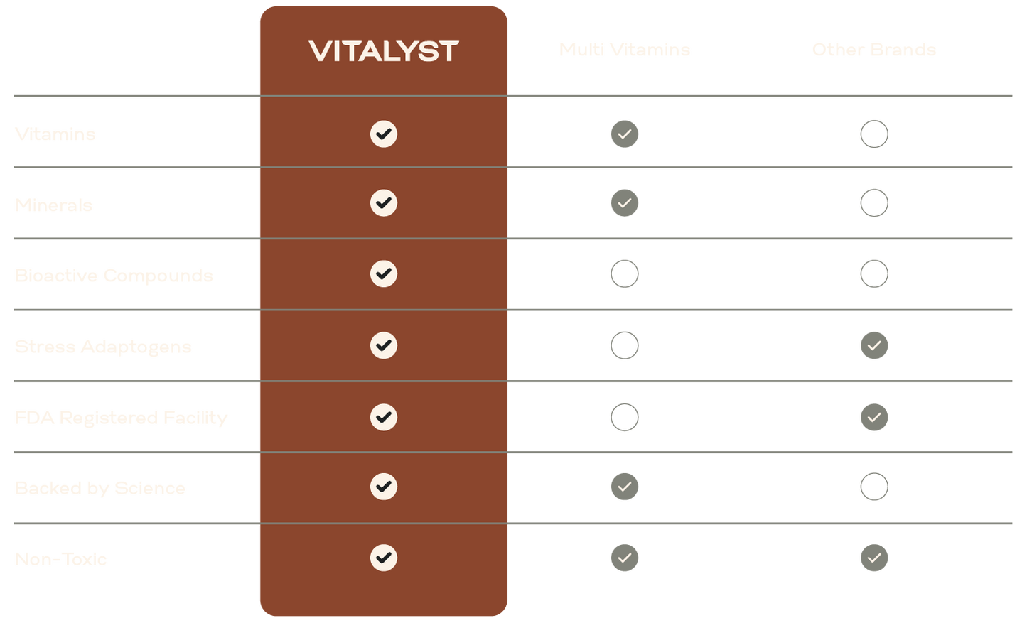Vitalyst's formula sets itself apart with a no-B.S. approach. Our ingredients are scientifically backed, carefully dosed without unnecessary excess, and devoid of artificial energy boosters or excessive vitamins.